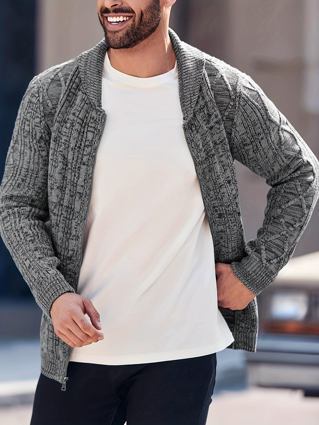 Mens Shawl Neck Cardigan Sweater Cable Knit Zip Up Closure with Pockets Winter Jacket Outerwear