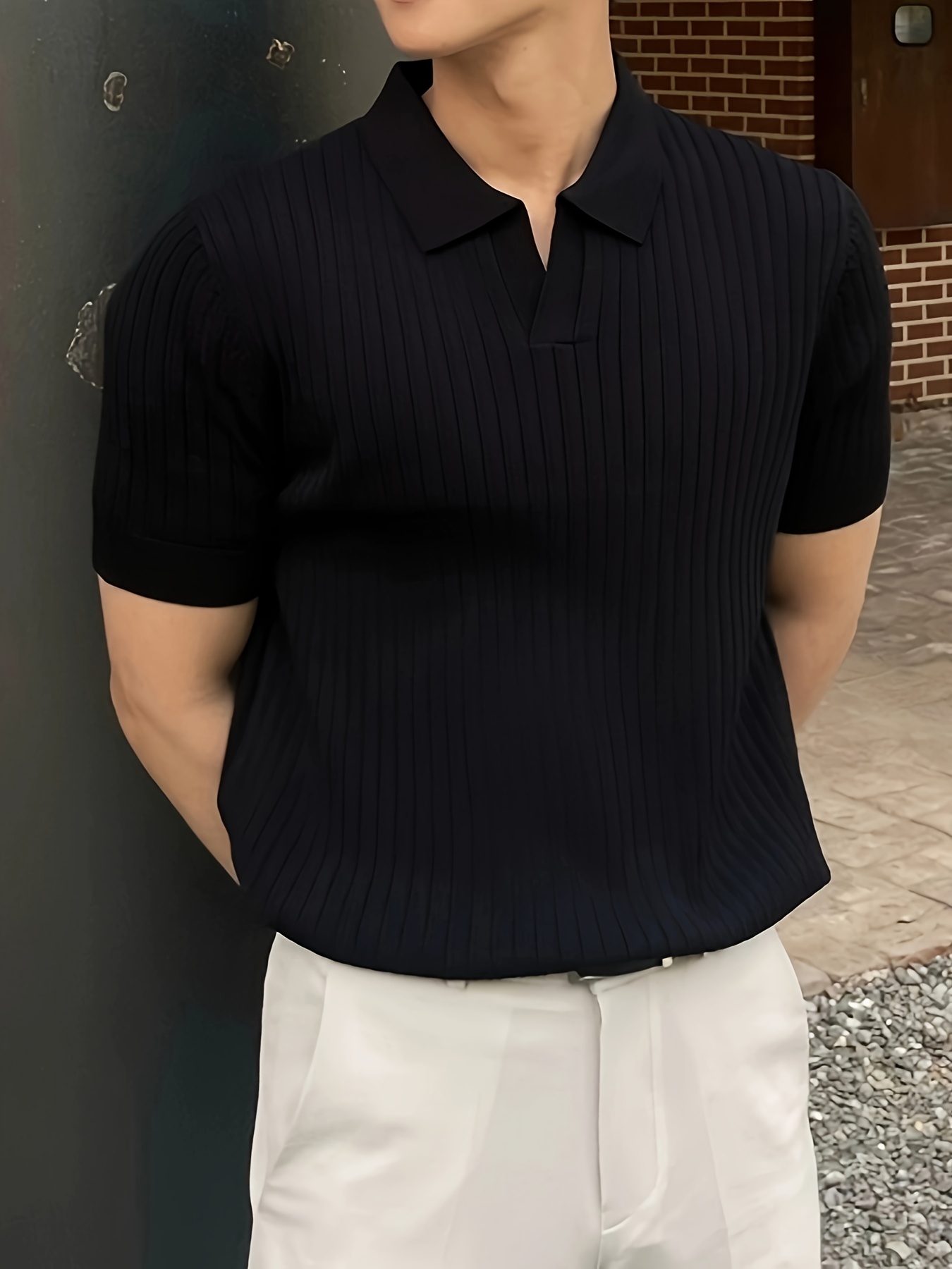 Men's Stripe Pattern Medium Stretch Short Sleeve Lapel Sweater, Men's Casual Solid Color V-Neck Top For Daily Wear & Business Clothing