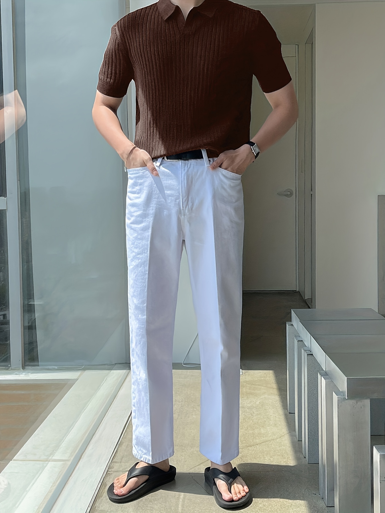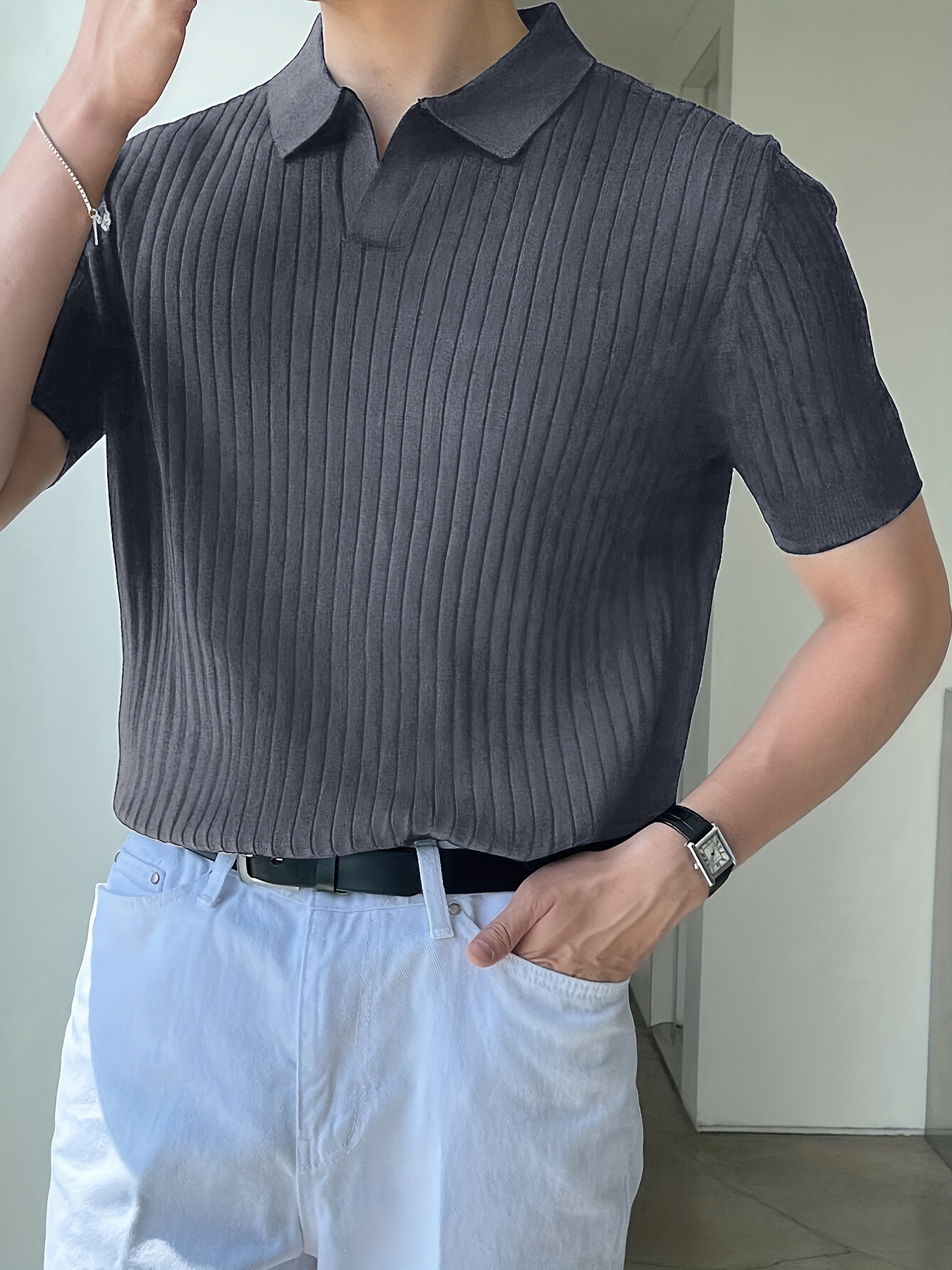 Stretchy V-Neck Pullover Shirt - Soft Ribbed Knit, Short Sleeve, Lapel Collar, Breathable, Moisture-Wicking, Golf and Daily Wear Essential - High-Quality Casual Top for Men